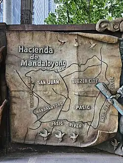 Ortigas Center began as the 4,033-hectare (9,970-acre) "Hacienda de Mandaloyon" (also known as "Mandaloyen," "Mandaloyong," or "Mandaloya"),[5][6] an estate from the Augustinian Order that spanned the present-day cities of San Juan, Mandaluyong, Quezon City, and Pasig. On January 20, 1920, the Augustinian friars sold this property to Dr. Frank W. Dudley and Don Francisco Ortigas. Dudley later surrendered his interest to Phil C. Whitaker, and the company became known as Whitaker and Ortigas. In the following years, there were several changes of partners. Then, on July 10, 1931, the company was incorporated as "Ortigas, Madrigal y cia., S. en C." as a limited partnership by shares (Spanish: sociedad comanditaria por acciones). The parties to the partnership were Francisco Ortigas (Don Paco), Vicente Madrigal, B.C.M. Johnston, Fulgencio Borromeo, Clyde A. Dewitt and future President Manuel L. Quezon.[7]