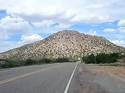 The main belt extends from the Cerrillos Hills in the north through the Ortiz Mountains to the San Pedro Mountains (35°14′47″N 106°11′17″W / 35.2463111°N 106.1880296°W) and South Mountain (35°11′03″N 106°13′17″W / 35.1840457°N 106.2213335°W). Cerro Pelon (35°19′36″N 105°59′28″W / 35.3266488°N 105.9912396°W) is also geologically a part of the belt. Each of the clusters of mountains is a laccolith where magma intruded between sedimentary rock beds and cooled to form a dome-shaped body of rock. Magma preferentially intruded along bedding planes in the country rock, particularly in beds of weaker rock such as shales of the Chinle Formation or Mancos Shale. In some places, the magma broke through to the surface as lava to form volcanoes. The overlying volcanic rock and sedimentary beds subsequently were eroded away to leave the more resistant laccoliths.[1]