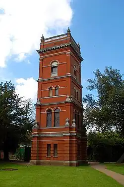 The water tower is a grade II listed building. It was completed in 1873 and is situated 50 metres to the west of the main school building. It is composed of 4 stages and is in total about 20 metres high.[4] The brickwork of the base stage has banded rustication angle-buttresses at the corners, each displaying an urn finial.[4] The second stage sports paired blind windows with semicircular heads. The corners feature less prominent angle-buttresses with fleur-de-lys finials. The third stage has more but smaller paired windows and the buttresses are here clasped. At the fourth stage there is a single large window featuring a balustrade. At the top there is a parapet with open balustrading and obelisk finials at each corner.[4]
