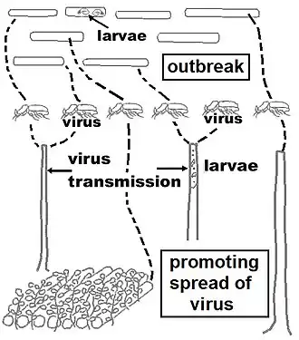 Infected third instar larvae typically die after around 3 weeks, 1st and 2nd instars earlier. Virus infections are, however, not transmitted to the pupal stage and adult beetles emerging from the pupae are always uninfected. They acquire infections through contact with infected larvae or adult beetles in breeding sites, or during mating and feeding in coconut palms. Virus infections reduce the lifespan and fecundity of the adult beetles. Infected females stop laying eggs and there is no transmission through the egg stage.[6][7][8]