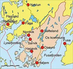 On 1 January 2020, the neighboring municipalities of Os and Fusa were merged to form the new Bjørnafjorden Municipality.[8]