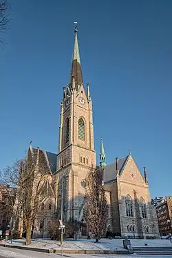 Oscar's Church (Swedish: Oscarskyrkan) is one of the major churches in Stockholm, Sweden.[1] The three-aisled hall church, which holds 1,200 people, has an 80-metre-high (260 ft) tower in the south-western part of the building. Oscar's Church is located in the south-eastern part of Östermalm, where Storgatan and Narvavägen meet, near the Swedish History Museum. Narvavägen is together with the nearby Strandvägen—from which the church is also visible—one of the city's main boulevards, lined with several residential palaces.[2]