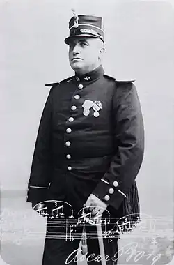 Oscar Borg attended the Royal College of Music (Musikaliska Akademien) in Stockholm, under the sponsorship of the Crown Prince of Sweden, later King Oscar II of Sweden. He entered the academy in 1869 and took the music director exam with top marks in the spring of 1872. He had a contractual obligation to return to his old band. He gave his first concert in his hometown as flautist and violinist during October 1872. When in 1881, conductor Friedrich August Reissiger resigned as director of the 1st Brigades Band, Oscar Borg was his replacement. Borg remained the director of the 1st Brigades Band in Halden until he resigned 11 June 1918.[2]