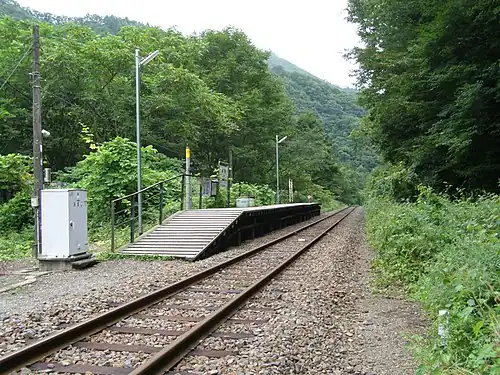 The station is located in an isolated rural area surrounded by mountains and forests. There are no stores or houses in the vicinity.