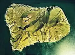 At 9.73 square kilometers (3.76 sq mi), Ōshima is the largest uninhabited island under Japanese sovereignty. The island is a double caldera with a scoria hill rising in the middle. It is the peak of two overlapping stratovolcanoes and their associated calderas, Mount Higashi and Mount Nishi.[1] The highest peak, Mount Era (江良岳, Era-dake) at 737 meters (2,418 ft),[2] is part of a triple volcano. The peak rises close to 2,000 meters (6,600 ft) from the sea floor. The island consists of mafic alkali and non-alkali volcanic rock, less than 18,000 years old.[3] On the south side of the island at Aidomari (北風泊, Aidomari), there is a lighthouse and a heliport operated by Japan Coast Guard.