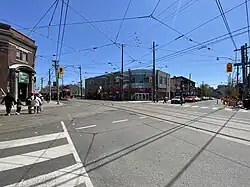 The 560-metre (1,840 ft) north–south segment of Dundas Street would become the contemporary "Ossington Strip", and was developed as a mixed commercial and residential street beginning in the 1840s.[5] The Ontario Provincial Lunatic Asylum was opened at the foot of Dundas and Queen Street in 1850.[6] From the 1850s to around 1900, the area was a center of Toronto's meatpacking industry, with slaughterhouses and stockyards on the blocks and laneways just to the east.[7]
