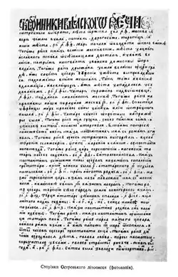 The Ostroh Chronicler (Ukrainian: Остро́зький літо́писець, romanizedOstróz'kyy litópysets') is a Ukrainian chronicle of the late 30s of the 17th century.[1] The NASU Institute of Ukrainian Language has designated it as a monument of the Ukrainian language (Ukrainian: Пам'ятка української мови, romanizedPam'yatka ukrajins'koj movy[2]).