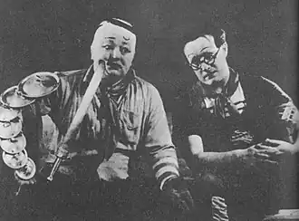 The first performance took place on 8 February 1926 with the play Georges Dandin by Molière (it was renamed Cirkus Dandin), the performance was not very successful.[2] In 1927 the theatre moved to Umělecká beseda and in that time Jiří Voskovec and Jan Werich first appeared on the stage with their own play Vest Pocket Revue, a montage of Dadaist gags, intellectual humour and jazz songs. The performance achieved great acclaim and Werich, together with Voskovec, became part of the ensemble. In the same year the young pianist and composer Jaroslav Ježek joined them, and together with Werich and Voskovec represented the core of the theatre group during its whole existence. They used masks inspired by the Fratellini clowns; Voskovec's mask was inspired by François Fratellini and Werich's by Albert Fratellini. Jiří Frejka together with another important exponent and founder, E. F. Burian, left the theatre due to disputes with the director Jindřich Honzl, an avant-garde theatre theorist who directed all the plays of the Osvobozené divadlo. The foursome (Voskovec, Werich, Ježek, and Honzl), but mainly Voskovec and Werich, gradually became the most important part of the group and their cooperation and contribution is still considered as very distinctive and legendary.[3]