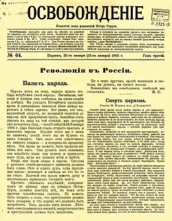 Osvobozhdeniye ("Liberation") was a liberal magazine during the final revolutionary years of the Russian Empire, prior to the October Manifesto in 1905. The periodical was established in 1902, and was in clandestine circulation until 1905. It was published in Stuttgart (Germany) and Paris (France), successively.[1][2]