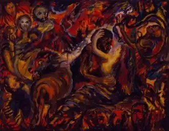 The physical substance of the paintings reflects a process of forming imagery that may correspond in form, texture, tone, and color to the subject it represents.[4] The intense colors and violent movement of the brush seem to add emphasis to the nature of the subject.[5] The embraces of the figures representing Othello and Desdemona are viewed by some as scenes that move "from tender and loving to confusion and rage."[6] When the Othello were exhibited at the gallery space of a theater in Atlanta in 1985, the paintings were considered “too provocative” and were taken down the day after the exhibit had been hung.[7][8][9]