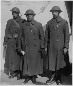 After the American entry into World War I, in April 1917, the 8th Illinois, still in national service, was renamed the 370th Infantry Regiment. It was the only African-American regiment to go into the American Expeditionary Forces (A.E.F.) while retaining most of its African-American command structure.[4] As the infantry took ship for the Western Front, Duncan became the field commander of the regiment's 3rd Battalion. Still in this capacity, he was promoted to lieutenant colonel on April 3, 1918. After the regimental commander, Colonel Franklin A. Denison, was replaced by a white officer, Lieutenant Colonel Duncan became the highest ranking African-American officer in the A.E.F. This was a significant achievement due to the segregationist attitudes of President Woodrow Wilson and his secretary of war, Newton D. Baker. While serving on the Western Front against the German Army, Duncan was awarded the Purple Heart and the French Croix de Guerre for gallantry in action.[1]