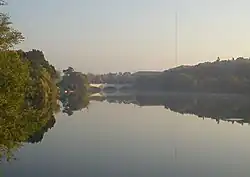 A view across the Otonabee river in Peterborough, Ontario, showing a part of the campus of Trent University. The Faryon bridge is to the right. -