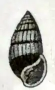 The white shell has a narrow chocolate band above and below the suture. The lower half of the body whorl is chocolate colored. The shell is longitudinally closely ribbed. The interstices are spirally striated. The length of shell varies between 8 mm and 15 mm.[2]