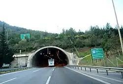 After Exit K3, the O-31 passes over the 559 m (1,834 ft) long Belevi viaduct and then enters the 3,048 m (10,000 ft) long 75th Anniversary Selatin Tunnel (Turkish: 75. Yıl Selatin Tüneli), passing through the Aydın Mountains and into Aydın Province.