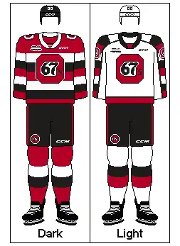 The 67's colours and original uniforms are based on those of the Ottawa Senators from the 1920s and 1930s. The team colours are red, white & black. The 67's dark jerseys, only slightly altered from the original design, have horizontal "barber-pole" stripes with the rectangular 67's logo. The 67's have also used a white background jersey with barber-pole stripes on the shoulders and sleeves.