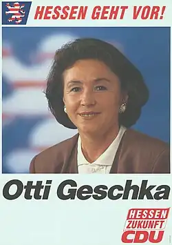 Otti Geschka (born Ottilie Bördner; 27 December 1939) is a German pediatric nurse and politician. Being a member of the Christian Democratic Union (CDU) she was elected as the first female mayor of Rüsselsheim, Hesse, in 1993 and was in office until 1999. She also served in the Parliament of Hesse representing CDU for two terms.