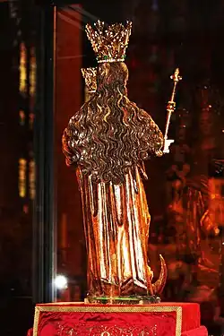 | Attributes | Blessed Virgin Mary, crowned and draped with a gilded cope, while carrying the Child Jesus holding a scepter |
