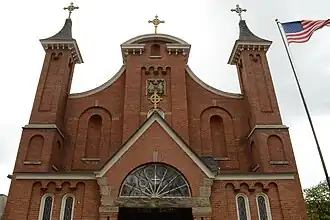 Our Lady of Victory Roman Catholic Church, also known as Our Lady of Victory / St. Joseph Roman Catholic Church, is a historic Roman Catholic church located at Rochester in Monroe County, New York. It was designed by noted Rochester architect Andrew Jackson Warner and is a French Romanesque Revival style brick cruciform plan church built in 1868. It features two slender towers with concave roofs, a recessed entrance inside a single-story protruding section, and a semi-circular stained-glass window.[2]: 14, 56, 58