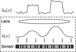 Consider a simplified camera model shown in Fig.1. The is the incoming light intensity field. By assuming that light intensities remain constant within a short exposure period, the field can be modeled as only a function of the spatial variable . After passing through the optical system, the original light field gets filtered by the lens, which acts like a linear system with a given impulse response. Due to imperfections (e.g., aberrations) in the lens, the impulse response, a.k.a. the point spread function (PSF) of the optical system, cannot be a Dirac delta, thus, imposing a limit on the resolution of the observable light field. However, a more fundamental physical limit is due to light diffraction.[9] As a result, even if the lens is ideal, the PSF is still unavoidably a small blurry spot. In optics, such diffraction-limited spot is often called the Airy disk,[9] whose radius can be computed as