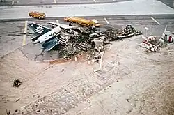 The aircraft's left and centerline main landing gear separated from the airframe while the right main landing gear collapsed. Wreckage was scattered over an area of 8,460 feet (2,580 m) long and 1,086 feet (331 m) wide. Pieces of the #3 engine were scattered across the runway while the other two engines remained attached to the airframe.[1][3]