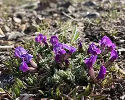 This plant is a matted, cushion-forming perennial herb with erect or prostrate stems just a few centimeters long. The leaves are up to 5 centimeters long and are each made up of several leaflets.[3] The herbage is coated in silvery gray hairs.[4] The inflorescence is a raceme of one or two purple or blue-violet flowers. Flowering occurs in June. The fruit is a papery, inflated, hairy, black legume pod up to 2.5 centimeters long.[3][4]