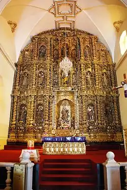 The main altarpiece completely covers the wall behind the main altar. The center part of the cut out and replaced by a Neoclassical one. Its restoration to a more original appearance is relatively recent and based on research by the INAH to determine what it probably looked like. In the center of the altarpiece is an image of the Immaculate Conception, surrounded by images of the saints associated with the life of the Virgin Mary as well as Franciscan friars such as Anthony of Padua, Diego de Acala Obispo, Francis of Assisi and Bernardino of Siena and others such as Saint Dominic and Augustine of Hippo. Two sculptures are missing... those of Saint Cecilia and King David due to theft.[3] Although extremely ornate, this piece is considered to be part of the "sober" Baroque tradition. The entire altarpiece is gilded and the main feature is the repeating Solomonic Baroque columns.[2]