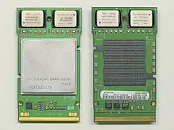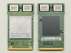 It consisted of 300 million transistors, of which 25 million were for logic, on a 23.6 mm by 15.5 mm (365.8 mm2) die.[14] It was fabricated by IBM in 0.13 μm SOI process with copper interconnects and low-κ dielectric. The PA-8800 is packaged in a ceramic ball grid array mounted on a printed circuit board (PCB) with the four ESRAMs, forming a module similar to those used by early Itanium microprocessors.