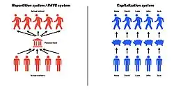 Another example for PAYGO is the German pension system. Employees have to pay into the pension system while they are working. The funds are immediately re-distributed. The amount paid into the system depends on the income and gives the payers so called "pension points" (de: Entgeldpunkte).[21] The medium income would give one pension point in a year. A maximum of two pension points can be collected per year. Each year the value of one pension point is calculated and pensioners receive money in proportion to their accumulated pension points and the income generated in that year for the whole pensions system.
