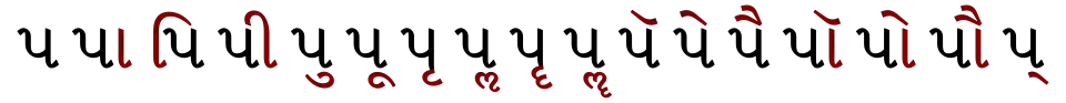 | प | पा | पि | पी | पु | पू | पृ | पॄ | पॢ | पॣ | पे | पै | पो | पौ | प् |