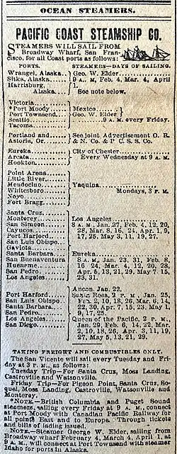 Beginning in 1881, they also took on the Seattle-Alaska route.[5] This led to Henry Villard's Oregon Improvement Company purchasing a controlling interest in P.C.S.S.C. (as well as in Goodall and Perkins's San Luis Obispo and Santa Maria Valley Railroad), retaining Goodall, Perkins & Co. as general agents.[5] This tied the steamship line in with the Oregon Improvement Company's Columbia and Puget Sound Railroad.[5] Oregon Improvement Company's financial collapse in the Panic of 1893 led to receivership and ultimately, in 1897, reorganization as the new Pacific Coast Company, headed by J.D. Farrell.[5] The new company prospered greatly in the Klondike Gold Rush.[5]