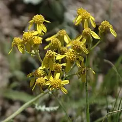 Packera fendleri is a species of flowering plant in the family Asteraceae known by the common name Fendler's ragwort. It is native to the southern Rocky Mountains, and is found in the states of Colorado, Wyoming and New Mexico, where it is a common plant that occurs in a variety of habitats.[1] It is a perennial herb, reaching a maximum height of around 16 inches tall.[2] It flowers between late May and early October, producing an inflorescence of 6–25 flower heads, each lined with 13 green phyllaries, and containing many disk florets and 6–8+ yellow ray florets.[1][2]