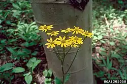 The inflorescence is a loose array of two or more flower heads with yellow disc florets and usually either 8 or 13 yellow ray florets up to a centimeter long each.
