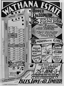 British settlement in Paddington commenced in the 1850s and the area was known as "Ti-Tree Flats" as the first residents moved there to cultivate gardens on the flats and to cut timber. The first sale of land occurred in 1859 with the sale of fifty-five lots.[6] The name Paddington comes from the name of the farm of Mr B, Clay who named his farm after his London birthplace of Paddington. The Paddington farm was sold and subdivided in 1864.[3]