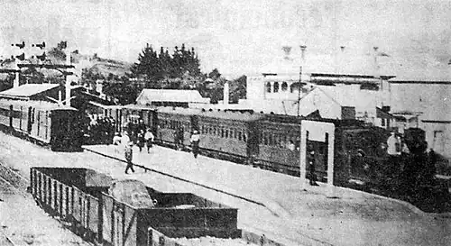 The first station was opened on 20 December 1895 by the local MP and Railways Minister, Alfred Cadman, when the line was extended 14 miles (23 kilometres) from Te Aroha.[1] It was at the north end of the main street, between Belmont Road and Railway Street.[2] A coal shed and telephone office were added in 1896, when the special station also had a platform, cart approach, 40 ft (12 m) x 30 ft (9.1 m) goods shed, loading bank, cattle yards, engine turntable and shed, stationmaster's house, urinals and a passing loop for 44 wagons. The station was improved in 1897, including access to a refreshment room, gas lighting in 1899 and a bookstall in 1910. A new turntable in 1900 allowed use of J Class engines.[3]