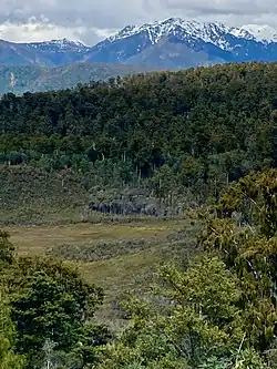Pakihi habitat ranges over 540 km (340 mi) of the west of the South Island, from Golden Bay in the north to Awarua Bay in the south, being particularly common in the central West Coast between Westport and Hokitika, usually near the coast but sometimes extending some 50 km (30 mi) inland.[2] Pakihi can be both natural or induced. Some pakihi has existed for thousands of years, even back to glacial times—for example, the Dismal or Sponge Swamp near Haast studied in the 1960s–1970s, where the base peat layer dates back 10,000 years.[2][3] The anoxic pakihi soil can halt the decomposition of fossil pollen and fragments of wood, allowing the study of ancient forest types on the site.[4]