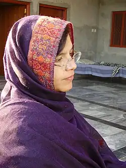 In Pakistan, upper and middle-class women in towns wear burqas over their normal clothes in public.[17][18] The burqa is the most visible dress in Pakistan. It is a garment worn over the ordinary clothes and is made of white cotton. Many upper-class women wear a two-piece burqa which is usually black in colour but sometimes navy blue or dark red. It consists of a long cloak and a separate headpiece with a drop-down face veil. Some educated urban women no longer wear the burqa, while some of them wear Hijab as an alternative. The burqa is also not worn by rural peasant women who work in the fields.[19] In rural areas only elite women wear burqas.[17][18] Purdah is still common in the rural elite and urban middle class, but not among rural farmers.[20]