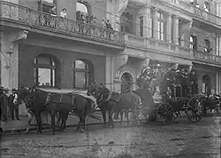 Passengers crowd a stagecoach in front of the hotel, c. 1905