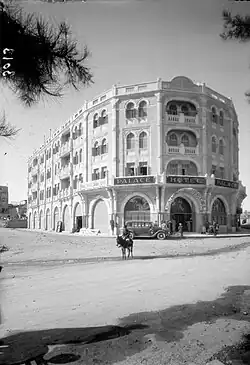 The Palace Hotel was built on Agron Street based on the plans of two Turkish architects Ahmet Kemmaledin and Mehmed Nehad, who were also hired by the Supreme Muslim Council to renovate the al-Aqsa Mosque.[2] The builders were Tuvia Dunia and Baruch Katinka, who also built the Shepherd Hotel in Sheikh Jarrah.[3] Construction began in 1928 and lasted 13 months. The Mufti wanted it to open before the King David Hotel and did whatever he could to expedite the construction.[1] The Council regarded it as both an economic investment and an Arab national project. The eclectic building style was influenced by neo-Ottoman architecture but also contained Greco-Roman and Moorish elements.[2] The Palace was one of Jerusalem's most luxurious hotels, with a stately entrance hall, marble accents, modern guest rooms and private telephones.[4]