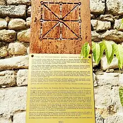 Coat of arms of the Medrano family in Viana (Calle San Miguel) with a gules field and an argent-cross fluery. The border featured the family's Ave Maria motto.[16]