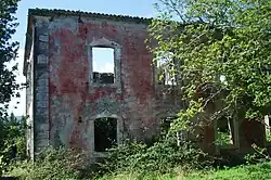The residence is a two-storey building, in a L plan with only its walls still standing, covered in ornate late-Baroque frame windows.[5] These walls are constructed of plastered stone masonry and painted in reddish pigment. To the rear of the main building is a more recent kitchen annex that runs parallel to the principal body that defines a servant's courtyard.[5] This space is delimited by a wall, and partially, by the two cisterns with vaulted ceilings.[5] In several locations, including on the eastern wall of the cistern and western wall of the building are decorated "fountains" plastered with shells.[5]