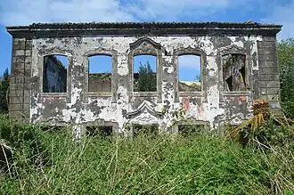 Pilar was the late 18th century residence of Manuel Inácio de Souza Sarmento, a rich politician in the municipal council of Horta and property-owner.[1][2] He inherited from his father, brother and father-in-law a vast inheritance that he parlayed into property on the island, becoming a self-made millionaire in the process.[2] Unlike many of the many estates in the Azores, this manor did not have any ancillary buildings normally associated with agricultural activities.[2] It was conceived, along with many of the original structures, as a property of leisure, a residence with two floors with access directly to the main garden.[2] Much of the palacette was constructed to function with the natural landscape.[2] The two larger facades, oriented towards the south and east, were covered with windows giving views of Horta and Pico. The building was encircled with artificial platforms, delimited by median walls that were at the time gardened, but today are mere pasture.[2] At the time, the mansion on Pilar was known for its library, considered more valuable than the libraries of the Franciscan friars of Horta, covered in wood brought back from Brazil and its ceiling encrusted with silver that imitated the heavens.[1] The construction of the property was made from material almost totally imported onto the island. The house was decorated with mirrors, chandeliers, crystal and porcelain. Its well-manicured garden included laneways lined with exotic plants and marble pool.[1]