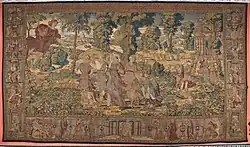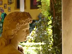 One of its main attractions is a large, decorative art collection which contains 1,425 artifacts. According to the newspaper El País, these items are protected under Andalusian law, prohibiting their sale and safeguarding their place in the palace. There is a large collection of Italian and Spanish paintings from the 16th and 17th centuries including Jacopo Bassano (Los cacharreros), Sofonisba Anguissola, Annibale Carracci, Francesco Furini (La creación de Eva), Luca Giordano, Giovanni Paolo Panini, Jusepe de Ribera (Cristo coronado de espinas), Francisco Antolínez, Joaquín Inza, and Neri di Bicci. There is also a watercolor by Jacqueline Kennedy Onassis, painted during her visit in 1960 when she stayed in the bedroom once used by France's Empress Eugénie de Montijo.[11] The paintings represent only a small part of the family's artworks, most of which are in Madrid's Liria Palace. The Palacio de las Dueñas also has a significant collection of antique furniture, ceramics, and other artifacts, including decorative arts, sculpture of Ancient Rome and contemporary (Mariano Benlluire), Flemish tapestries of the 16th and 17th centuries (Willem de Pannemaker), mosaics, and many other pieces of art.