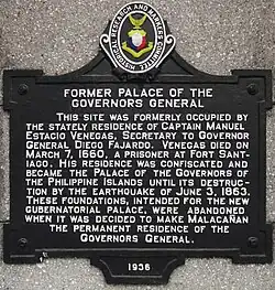 5. ^ Former Palace of the Governors General [sic] (Marker on building facade). Palacio del Gobernador in Intramuros: Historical Research and Markers Committee. 1936.