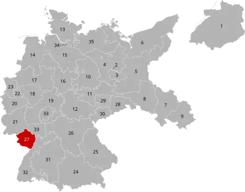 Its boundaries corresponded to the contemporary Regierungsbezirke of Palatinate within the Free State of Bavaria. It was constituency 27 in the numbering scheme.[1] Following the Saar plebiscite of 13 January 1935, the Saar was incorporated into Nazi Germany on 1 March 1935. The new territory was merged with the Palatinate, and the electoral district was renamed Palatinate–Saar.[2]