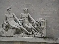 Along the outside is a basin with a statuary group of a man and women depicting The Arno and it Valley by Italo Griselli. The entrance is through well lit porticos.