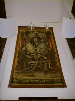 The interior uses fine marbles from across Italy, including green serpentine marble of the Alps, fish-veined marble, white Carrara marble, red Levanto marble, pink Castelpoggio marble, and the multicolored-veined Arni marble. The main salon is ten meters high, and illuminated through a glass mosaic curtain, which derives light through alabaster slabs. In this hall, known as the presidential hall, are hung four tapestries that including ominous depictions ancient and modern militaristic themes, including two facing works, one depicting ancient Roman armor, fasces, and eagle standards, and the other, a collection of modern armaments. The stucco decorations on the piano nobile (first floor) depict an episode of the siege of Florence, designed by Mario Moschi, and the construction of the dome by Brunelleschi, designed by Giannetto Mannucci.[2][3][4]
