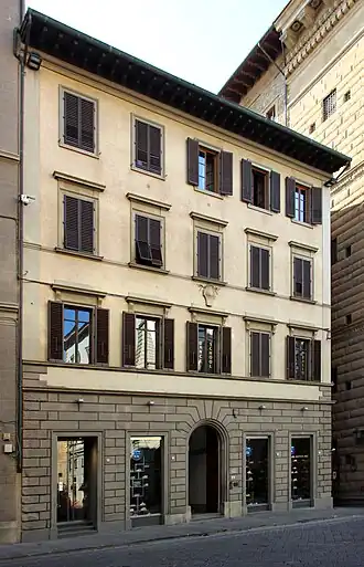 This is a four-storey building arranged on five axes, of late 19th-century style which, in deference to the character of the square (and also because of its proximity to the Palazzo Strozzi, from which it is separated by a chiasso), flaunts a bugne facing in artificial stone throughout the height of the ground.[1]
