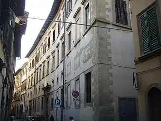 The portal (later transformed) is attributed to Bartolomeo Ammannati, but has no relation[2] with the 18th-century relief by Ferdinando Ruggieri that refers to the Palazzo del Cavalier Vernaccia, at the time owner and united to the Caccini by marriage ties. Restoration of the façade in 2022 revealed that the portal of house no. 31 is in the Ammannatesque style, and that the drawing[3] of the portal of house no. 33 is attributable to Pasqui, when he redesigned the façade. The façade, with its slightly broken lines, organised on three floors plus a mezzanine for no less than thirteen axes, is the result of restoration work carried out by the architect Leopoldo Pasqui around 1843, as attested by Federico Fantozzi.