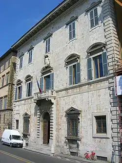 The recently enriched mercantile Toscanelli family acquired the palace in 1827; and restored it using the architect Alessandro Gherardesca. Giovan Battista Toscanelli and his wife Angiola Cipriani lived in the palace, and garnered a large and prominent art collection.[2] Among the artists in the painting gallery were Cornelis Bloemaert, Agnolo Bronzino, Pietro Ciafferi, Jacques Courtois, Carlo Dolci, Francesco Fidanza, Károly Markó the Younger, Cornelis van Poelenburgh, and Piero Zuccheri.[3] Among the artists employed in decoration of the rooms of the palace in the 1830s were Giuseppe Bacchini, Luigi Venturini, and Benvenuto Brazzini.[4] The palace, once had a peculiar Mannerist marble sculpture, part of a fountain, that displayed a chimeric female figure extruding bare breasts, but possessing wings, fins for feet, and a long tail. She sits atop a frog. The statue has been attributed to either Michelangelo or one of his followers, Silvio Cosini or Niccolo Tribolo.[5] The statue is now in Palazzo Blu in town.