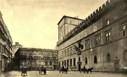 Palazzo Venezia before 1886, with buildings arranged largely as in the time of Pope Paul III, view from north: right: east facade of Palazzo San Marco: centre: the Palazzetto (demolished in 1910); background, left: Tower of Paul III (demolished in 1886) on Capitoline Hill, connected by a covered arched viaduct to the top floor of the Palazzetto.